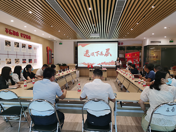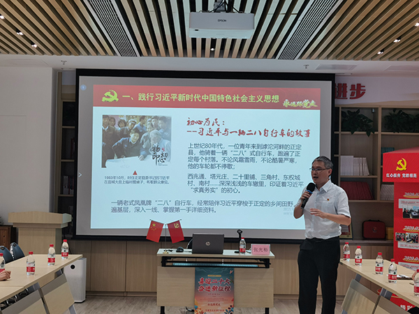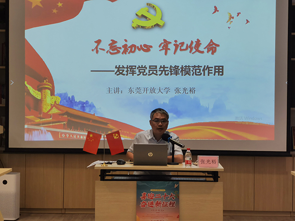 为全面贯彻党的十九大精神,以习近平新时代中国特色社会主义思想为指导,深入贯彻习近平总书记重要讲话精神,加强对商圈党组织党员干部、预备党员及入党积极分子的教育管理,着力推进商圈党建标准化规范化建设,锻造坚强有力的商圈党组织,根据《关于开展东城街道党校“送课下基层”活动的通知》,2022年7月20日下午,民盈国贸商圈党总支邀请东莞市优秀教师、东莞开放大学信息中心主任张光裕到民盈·国贸党群服务中心开展“不忘初心、牢记使命”——发挥党员先锋模范作用专题党课,共有20名党员参加。